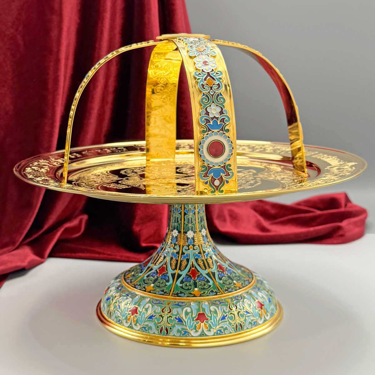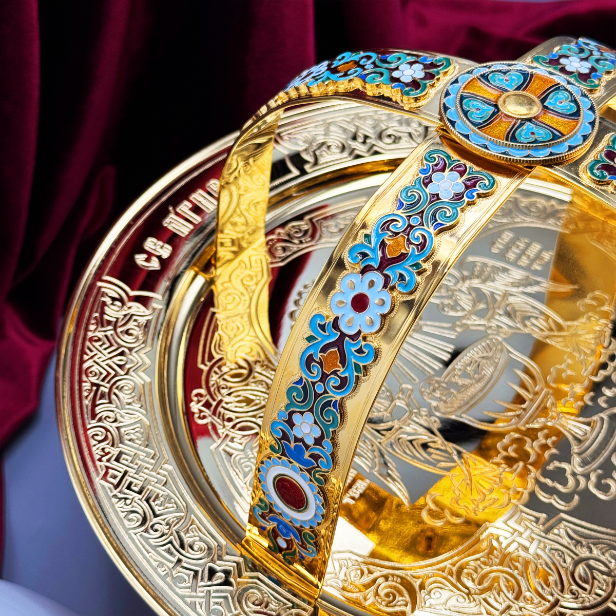 Представляем вашему вниманию евхаристический набор, выполненный в сочетании серебра, позолоты и высококачественного ювелирного сплава. Изделия изготовлены с любовью и благоговением для святого таинства Причастия. Данный набор является истинным произведением искусства, где каждый элемент пропитан глубоким символизмом и духовной значимостью. Все элементы покрыты позолотой, которая нежно блестит, отражая свет. Изделия декорированы эмалью и образами написанными на перламутре.