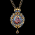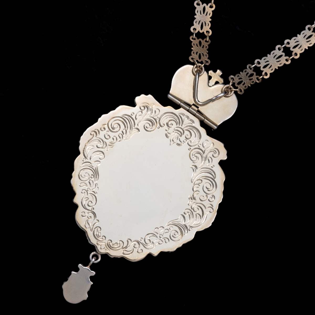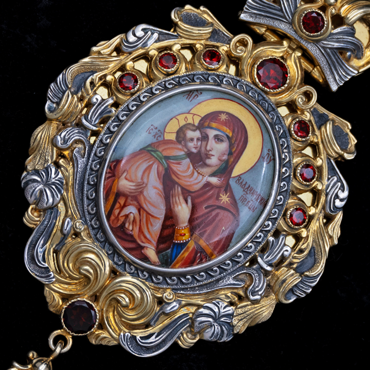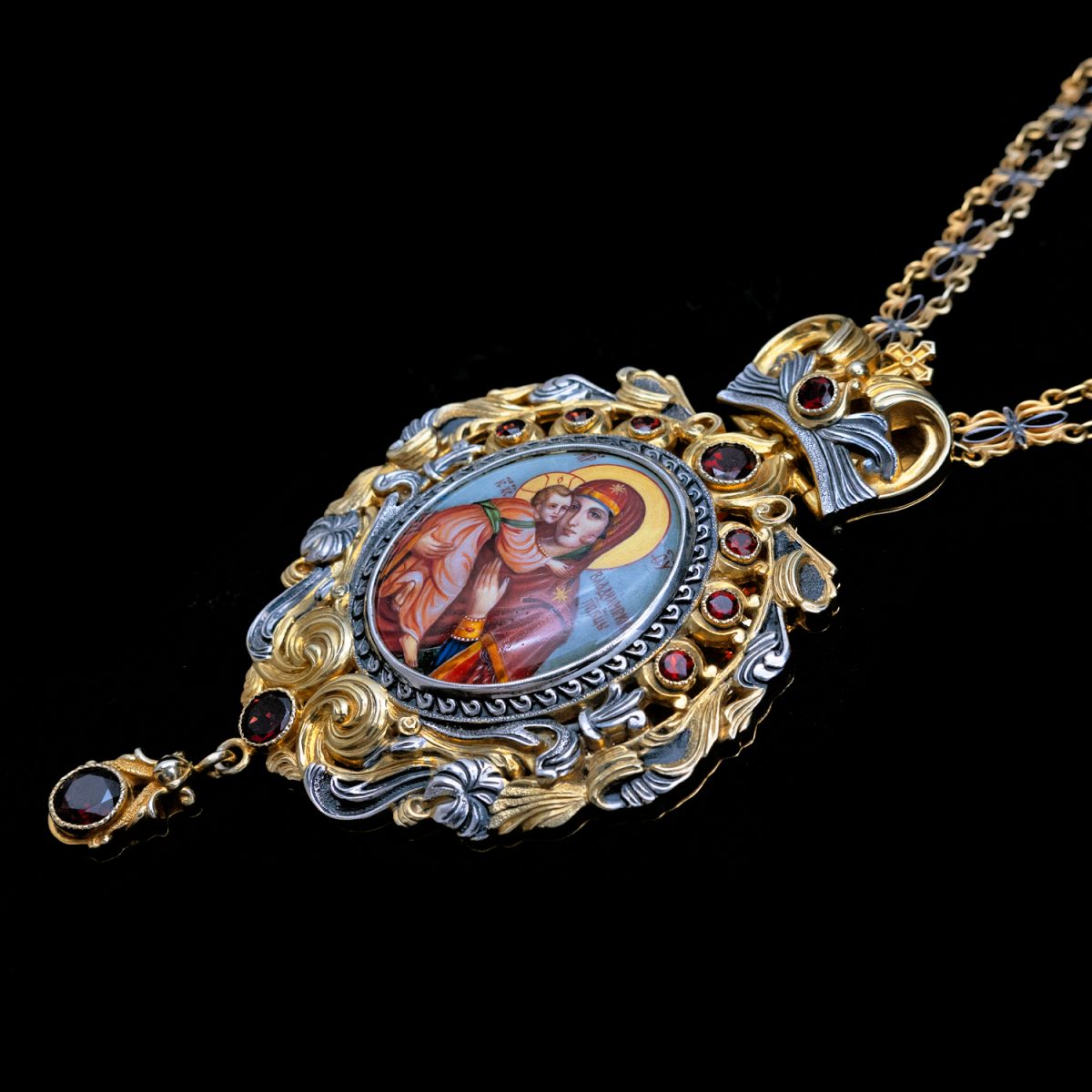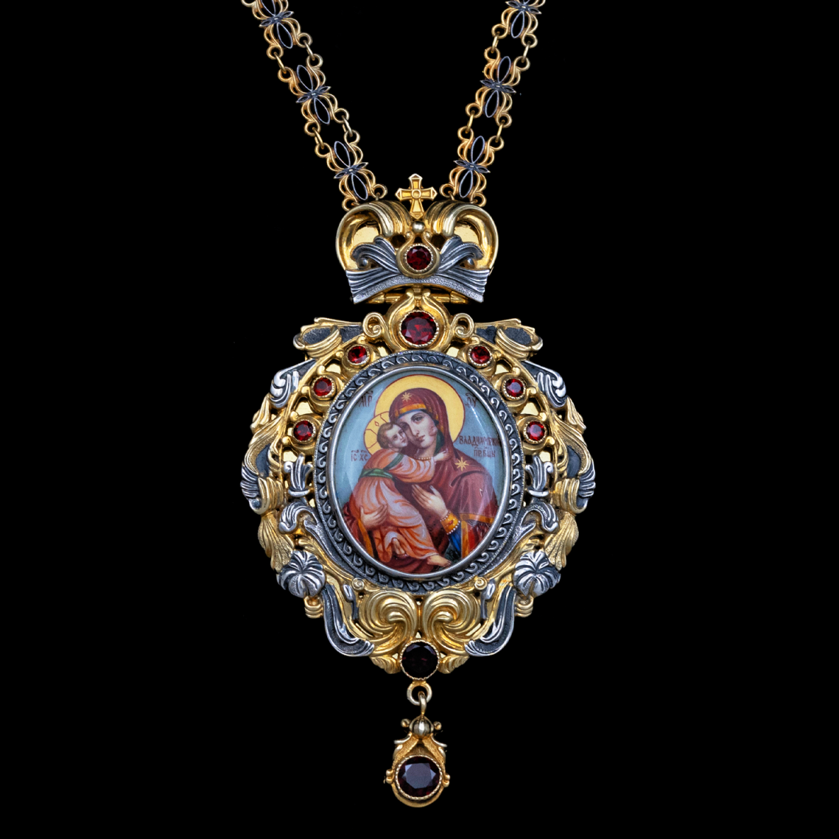 Оправа изделия выполнена из серебра с применением контрастного сочетания позолоты и патинирования. Пышный растительный орнамент украшен вставками из натурального граната насыщенного красного цвета, расположенными симметрично по периметру и на подвижной подвеске. Венчает панагию навершие в виде стилизованной короны с крестом, соединенное с массивной декоративной цепью, звенья которой также выдержаны в единой двухцветной гамме.