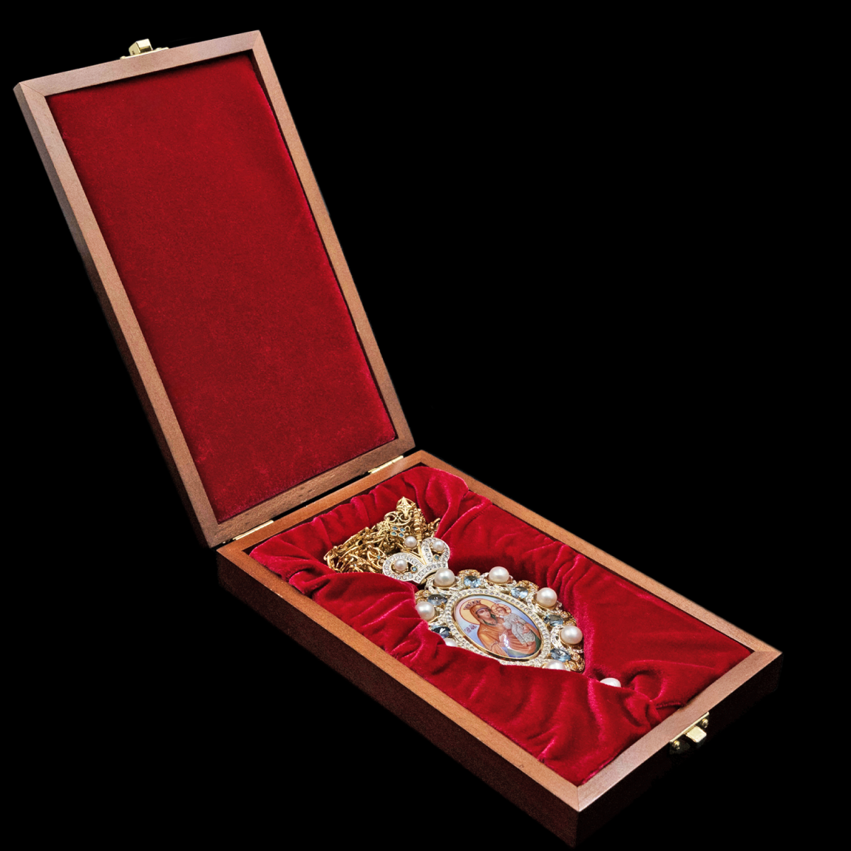 Панагия реализуется в фирменной деревянной упаковке с бархатным ложементом внутри. Наша упаковка создана специально для обеспечения надёжной защиты изделия во время транспортировки и хранения.