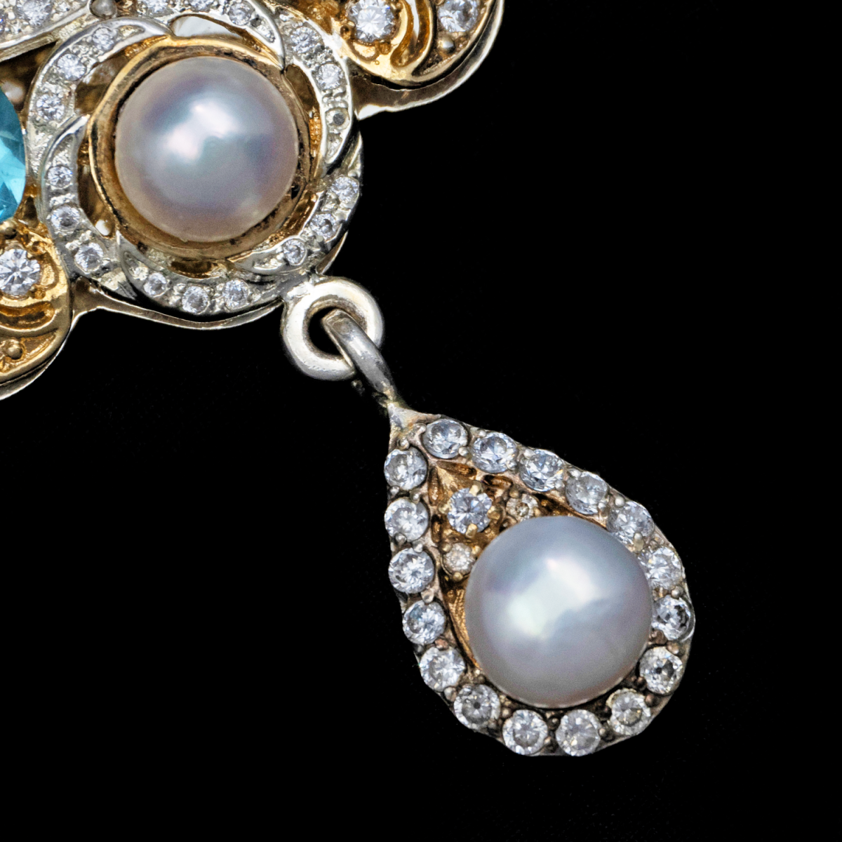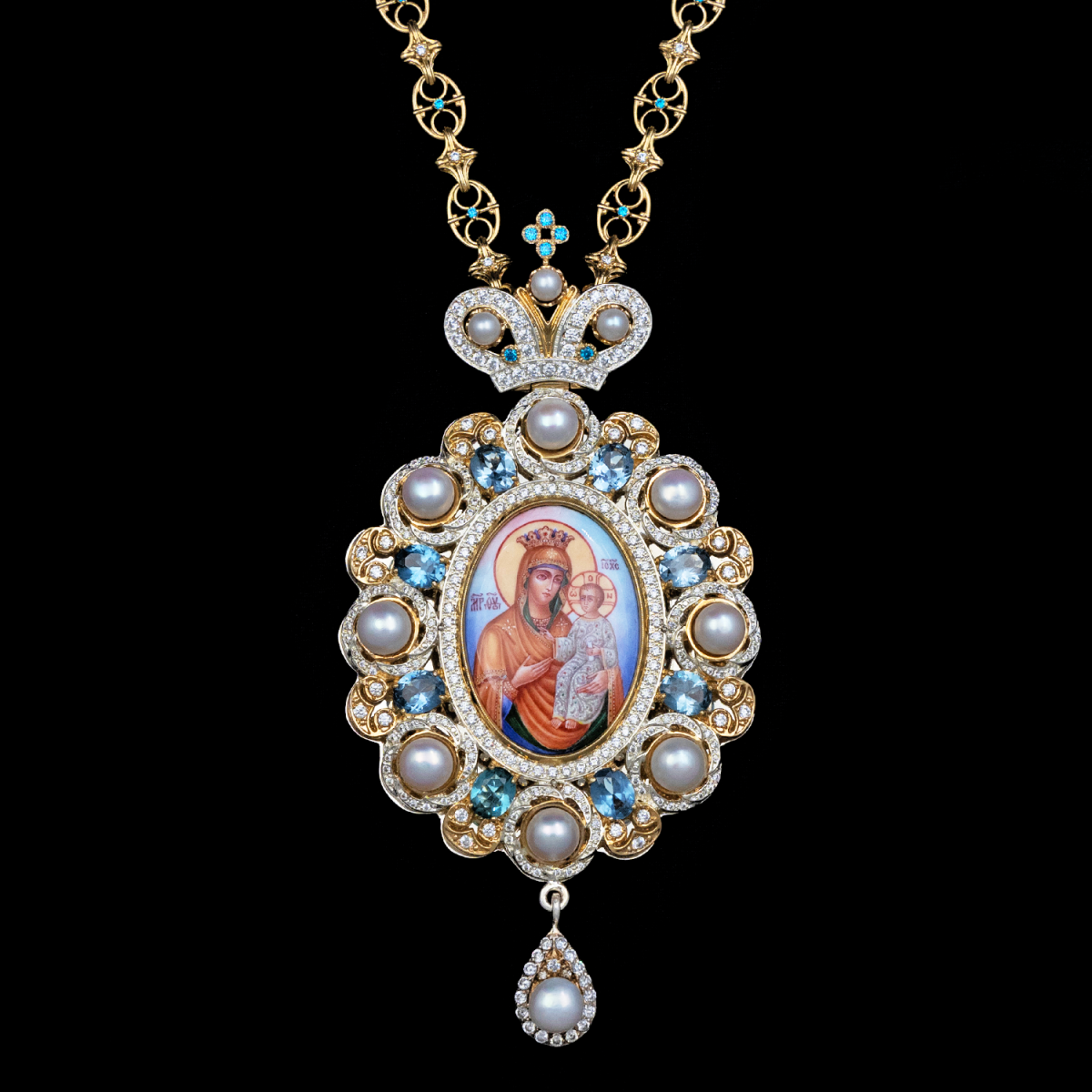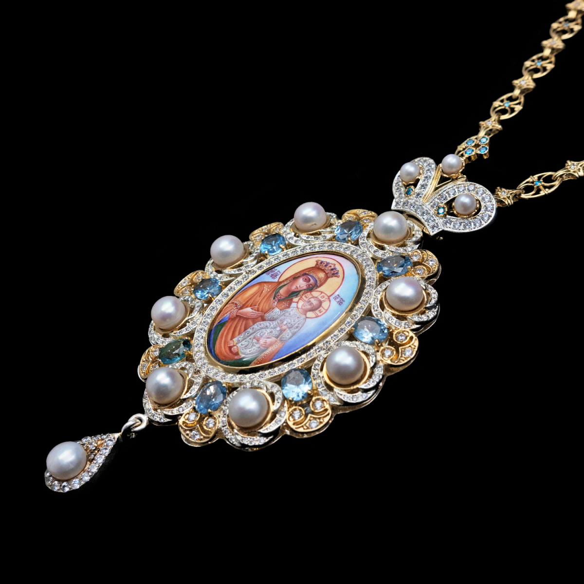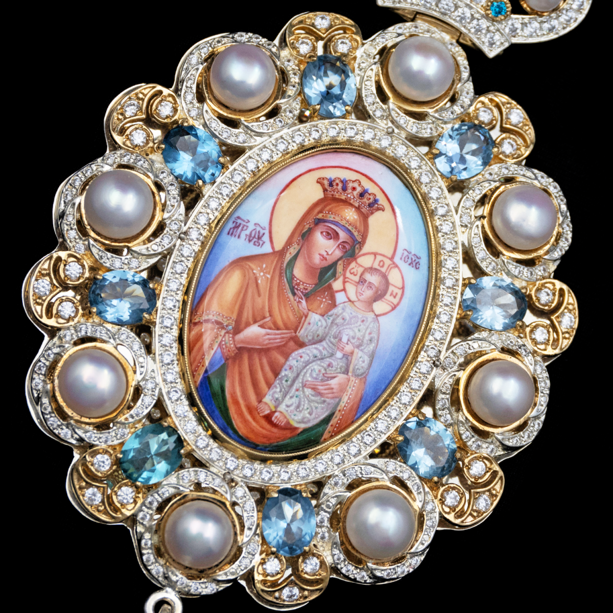 Вокруг иконы расположены вставки из жемчуга и топаза, которые украшают изделие.