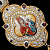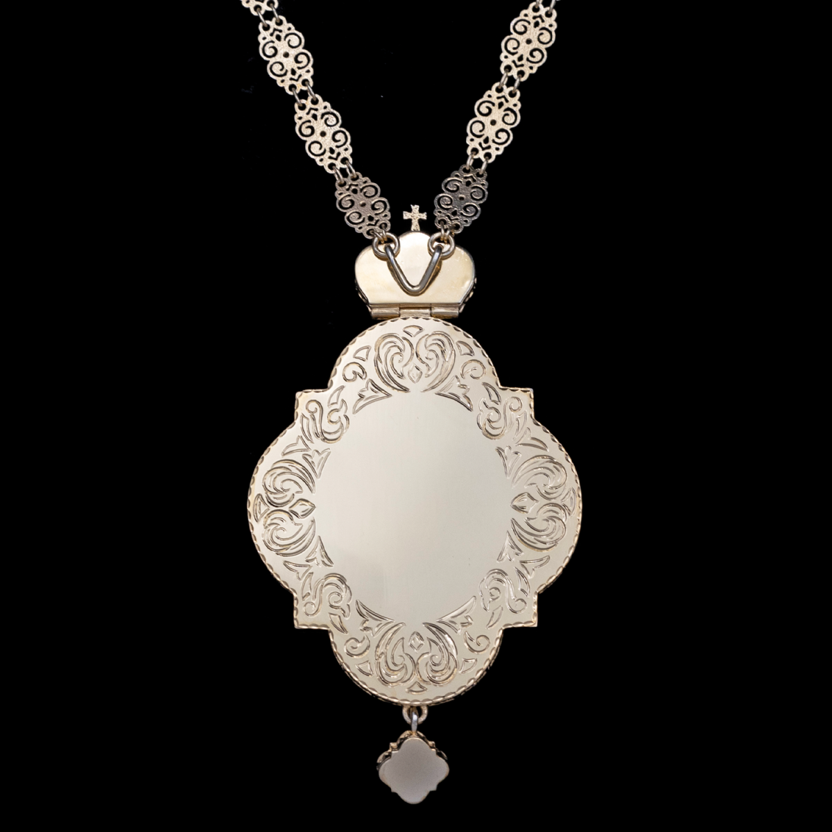 Центральным элементом украшения является икона Богоматери, выполненная техникой финифти — эмалевого миниатюрного художественного росписа, который выделяется яркостью и стойкостью красок.