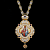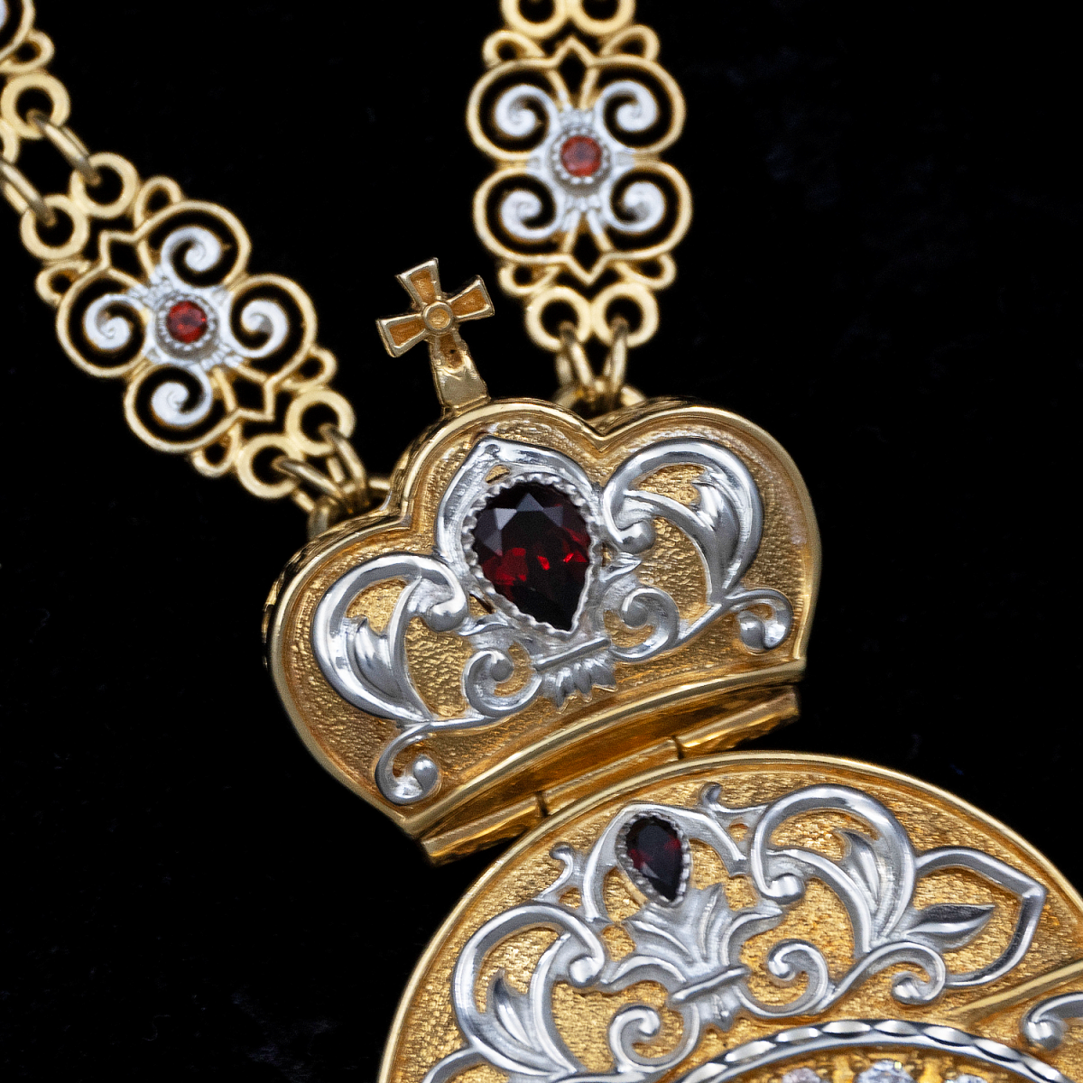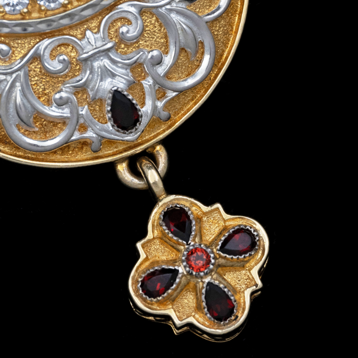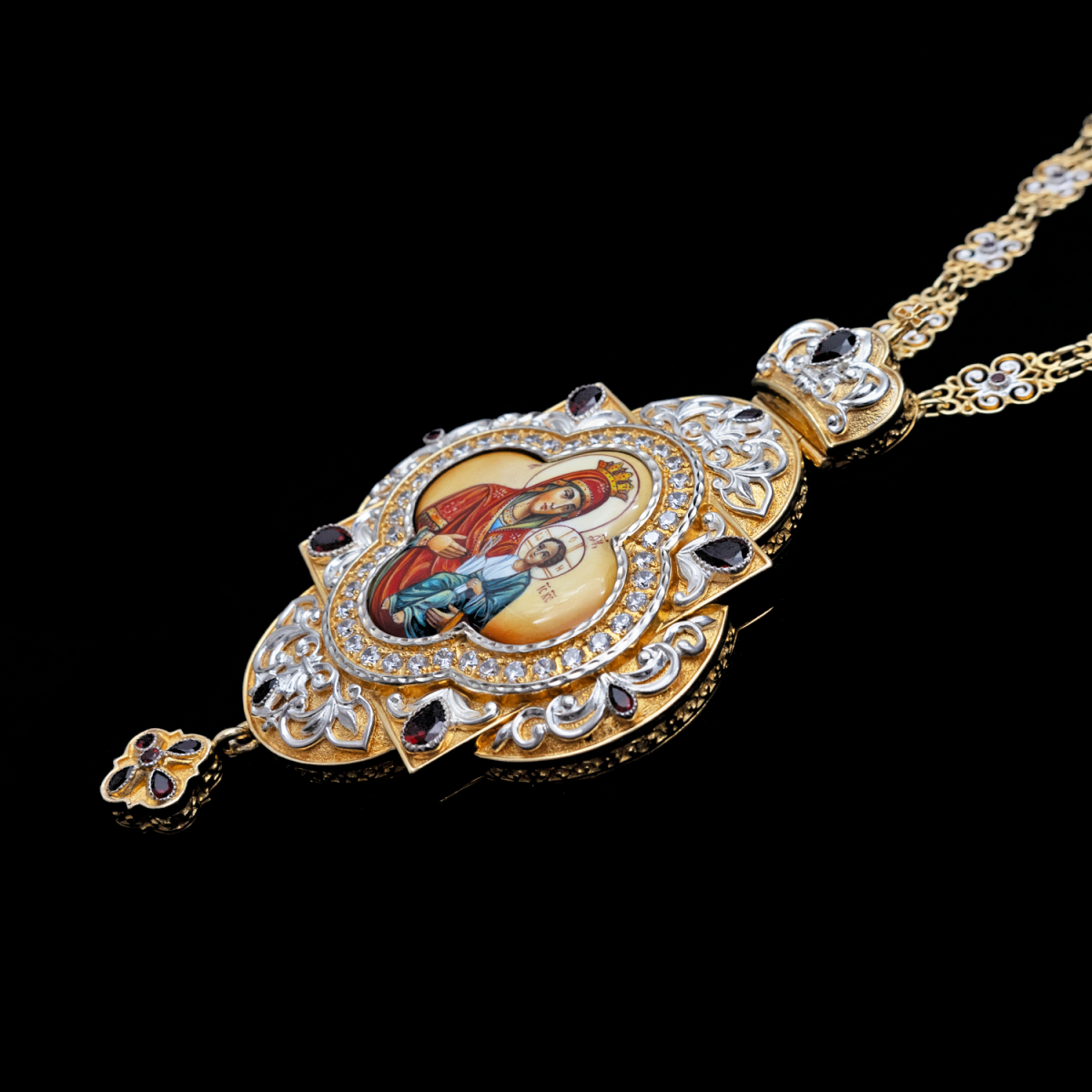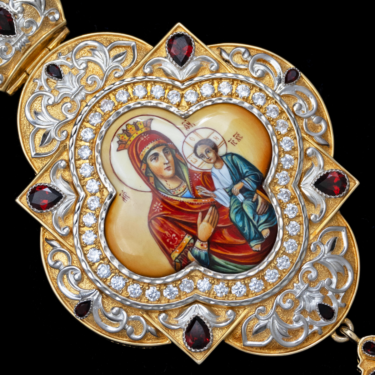 Вокруг иконки и в декоре использованы вставки из пиропа — драгоценного граната, отличающегося глубоким красным цветом, и фианитов, которые придают сияние и дополнительную игру света.