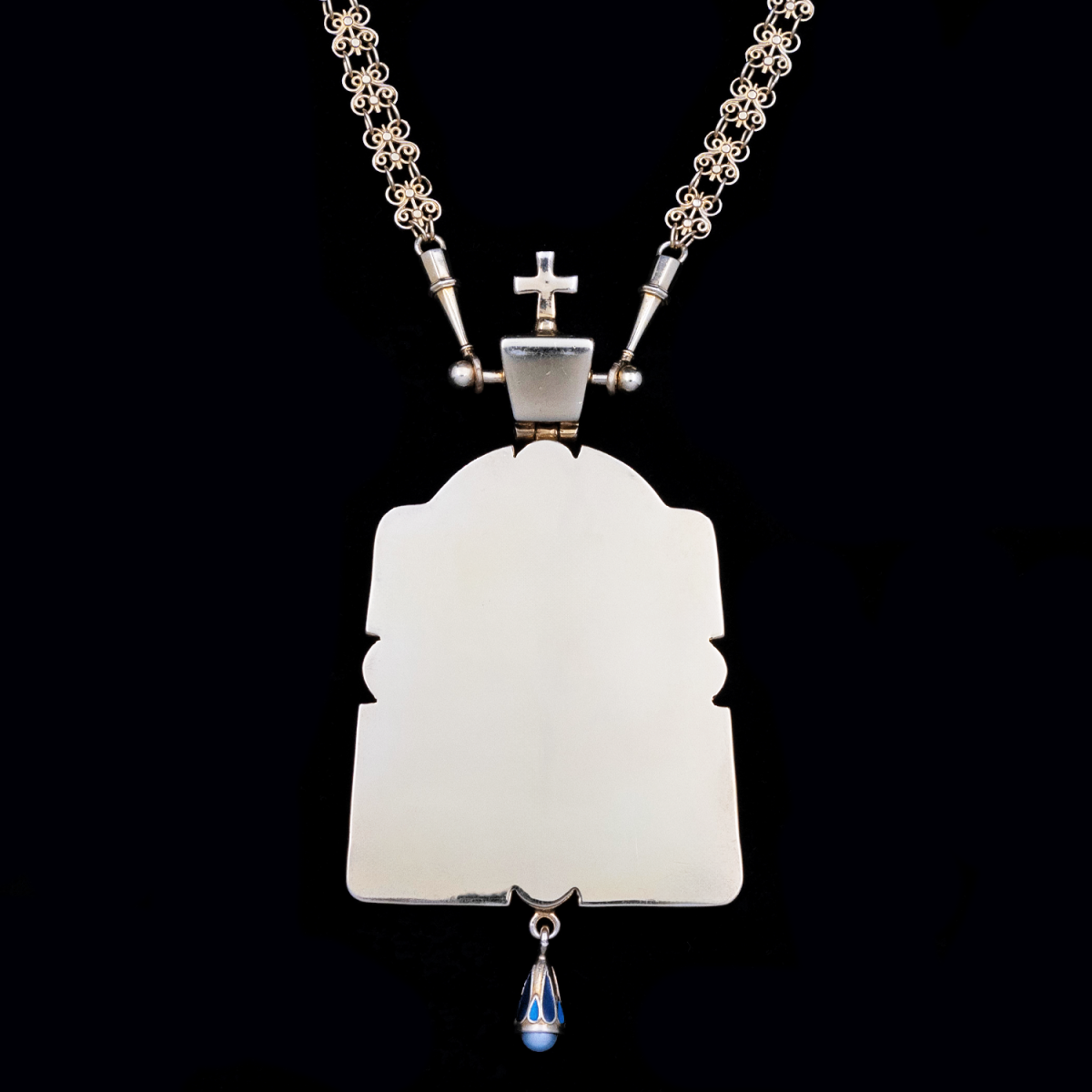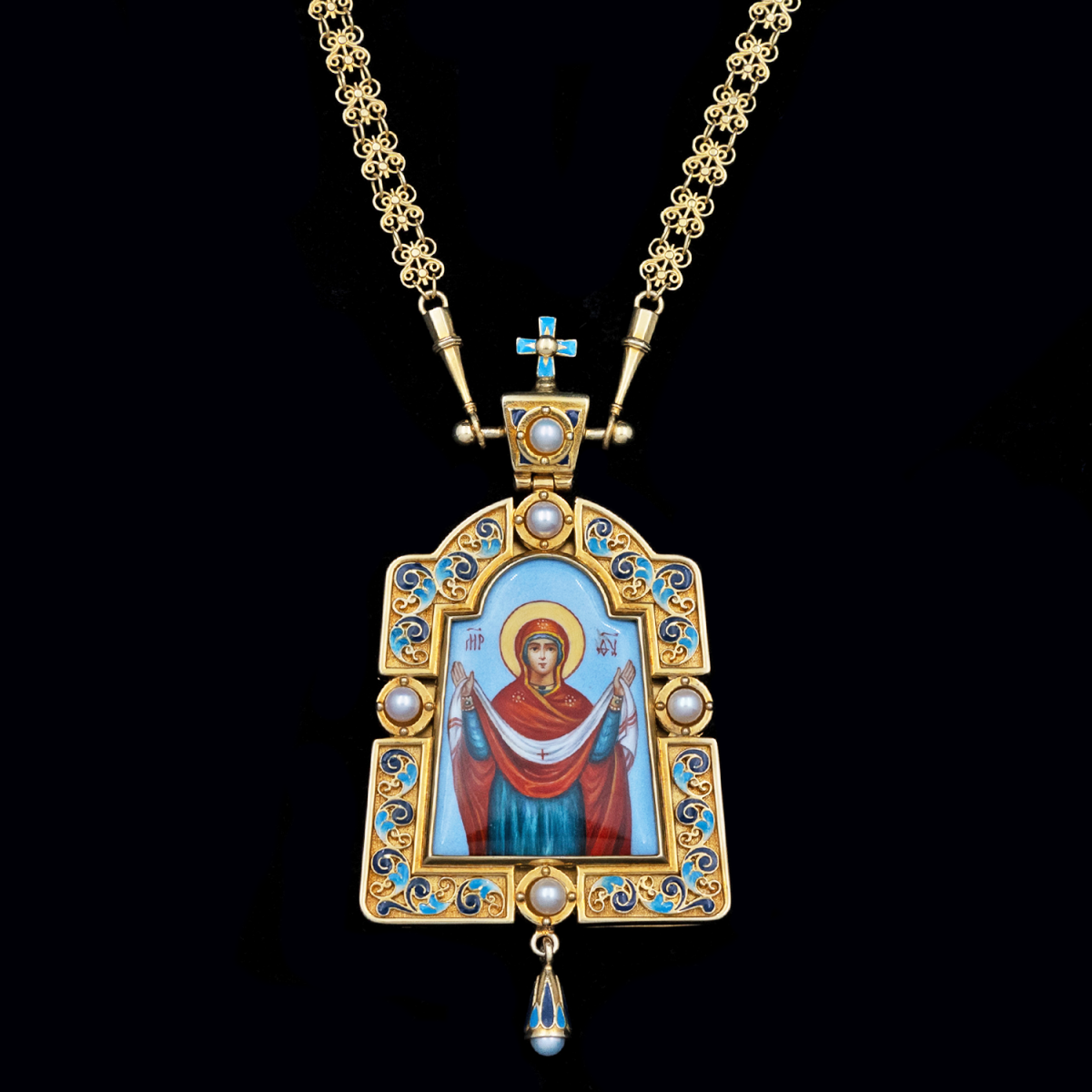 Панагия выполнена из серебра с позолотой и украшена жемчугом и цветной эмалью. Изделие обрамляет образ Покрова Пресвятой Богородицы: небесно‑голубая эмаль создаёт светлый фон, на котором мягко сияют золочёные завитки орнамента. По сторонам и вверху — круглые жемчужины, подчёркивающие оправу; внизу — подвижный каплевидный подвес с эмалевыми вставками и жемчужной «росой». Завершает композицию миниатюрный крестик с голубой эмалью, а декоративные шарниры и ажурная цепь поддерживают единый стилистический строй изделия.