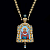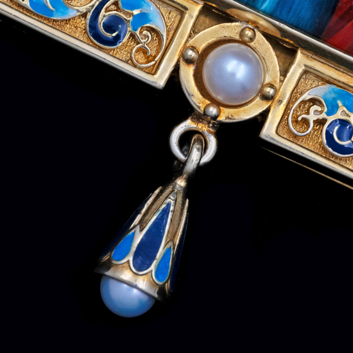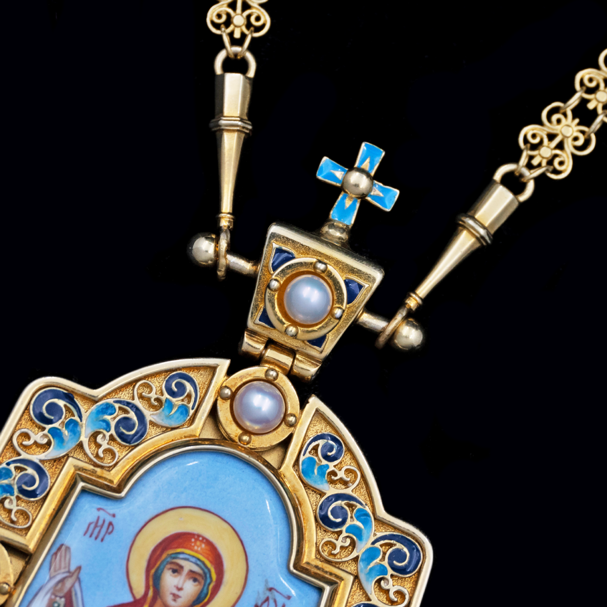 Контраст тёплого золочёного блеска, холодного перламутрового мерцания жемчуга и чистых небесных тонов эмали придаёт панагии ощущение внутреннего света.