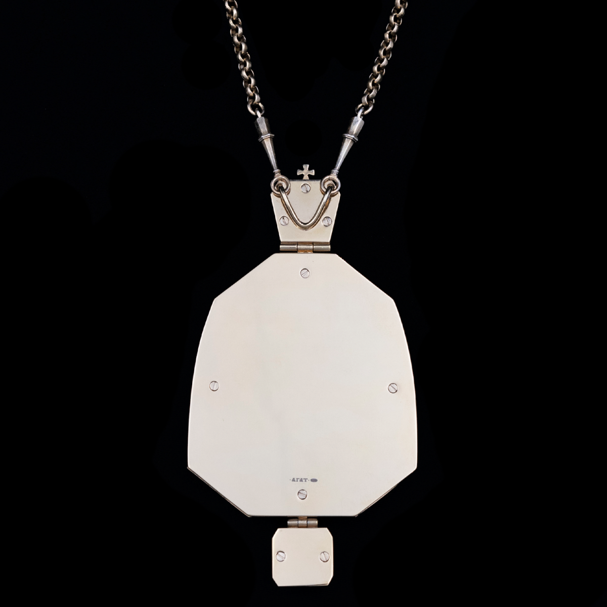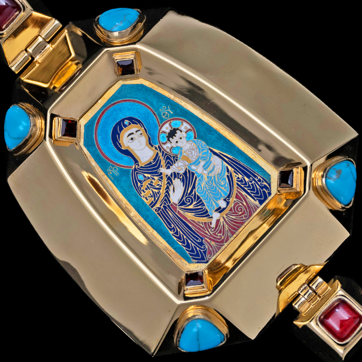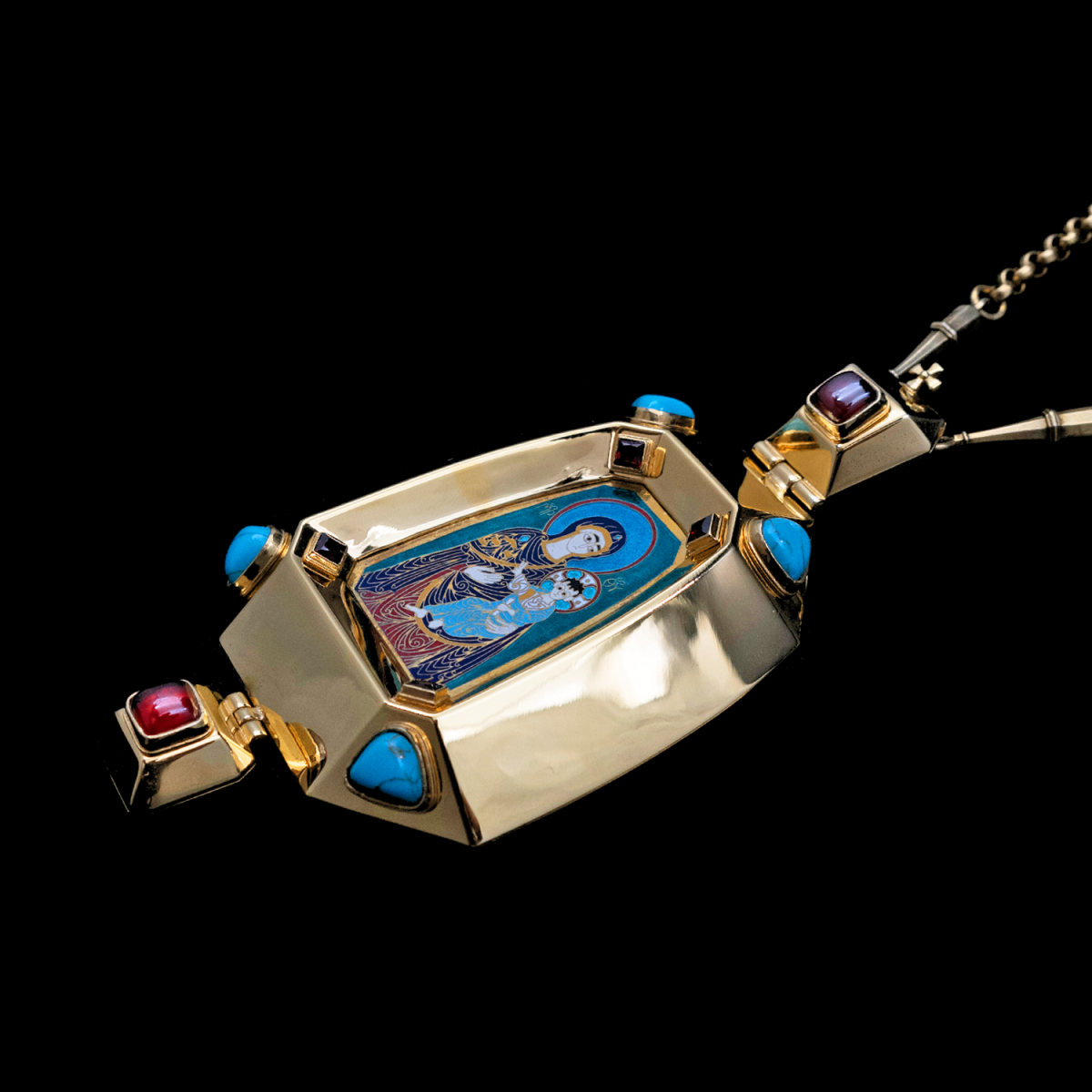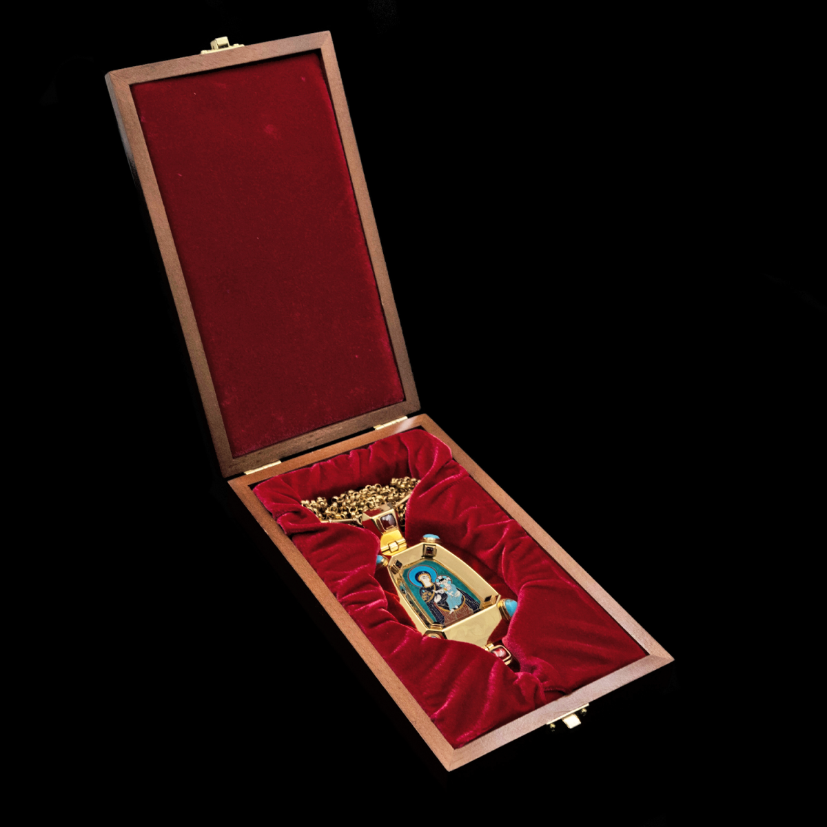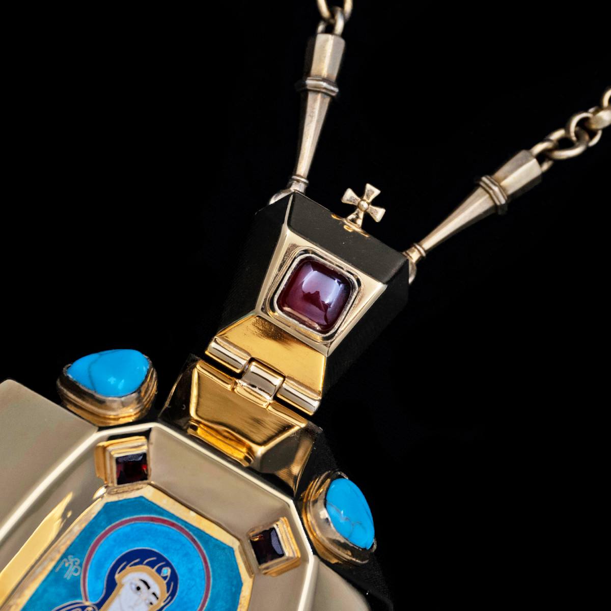 Архиерейская панагия из серебра 925 пробы, покрыта золотом гальваническим методом. Такое покрытие продлевает срок службы изделия и защищает от внешних неблагоприятных воздействий. Изделие декорировано горячей запильной перегородчатой эмалью, и вставки из камней граната, бирюзы. Продается в фирменной упаковке из дерева с бархатным ложементом.