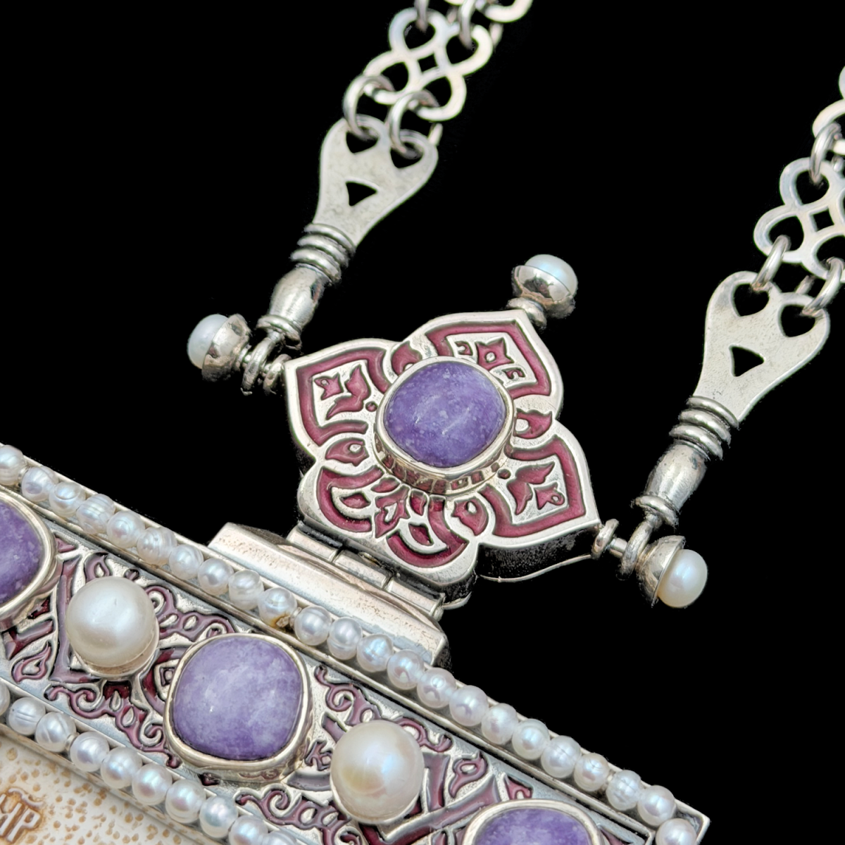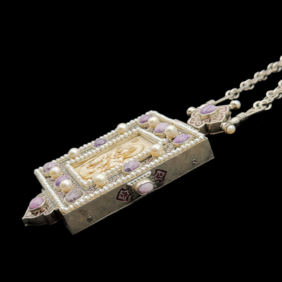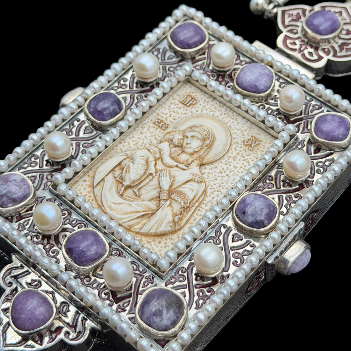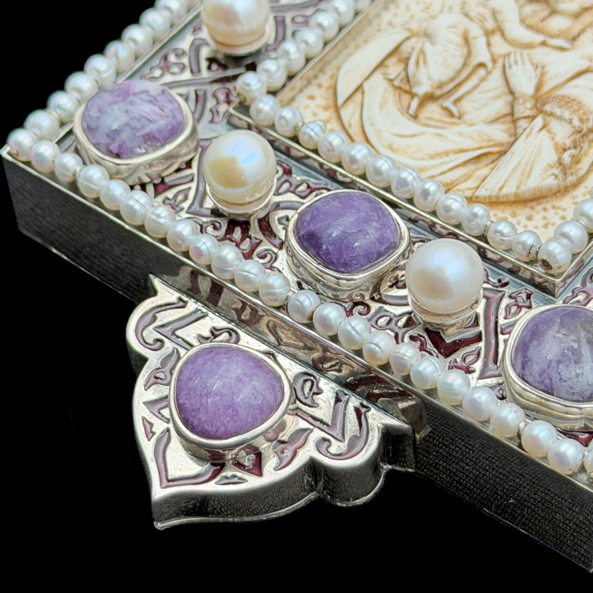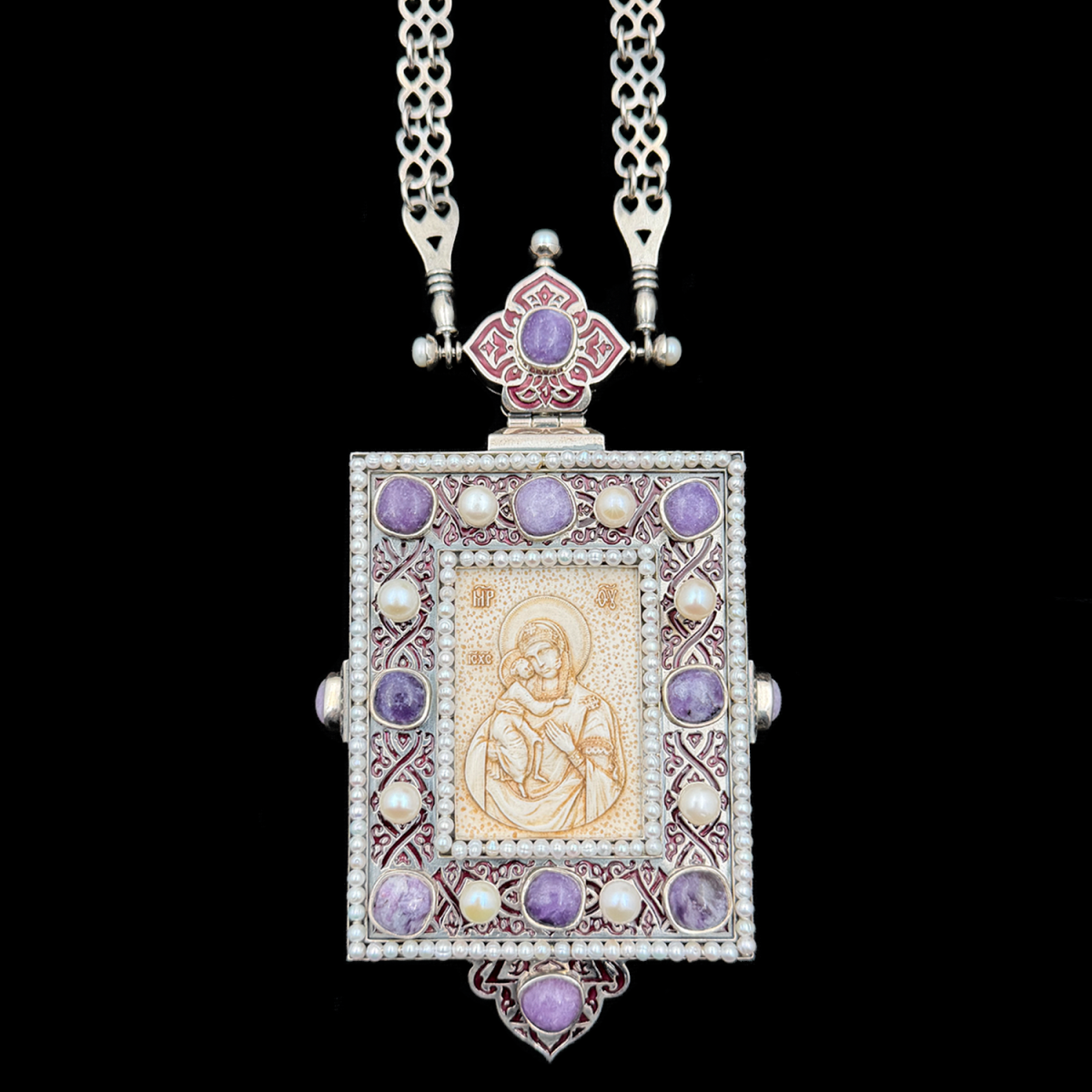 | Вставки | Бивень мамонта, жемчуг культивированный, горячая эмаль, лепидолит | |