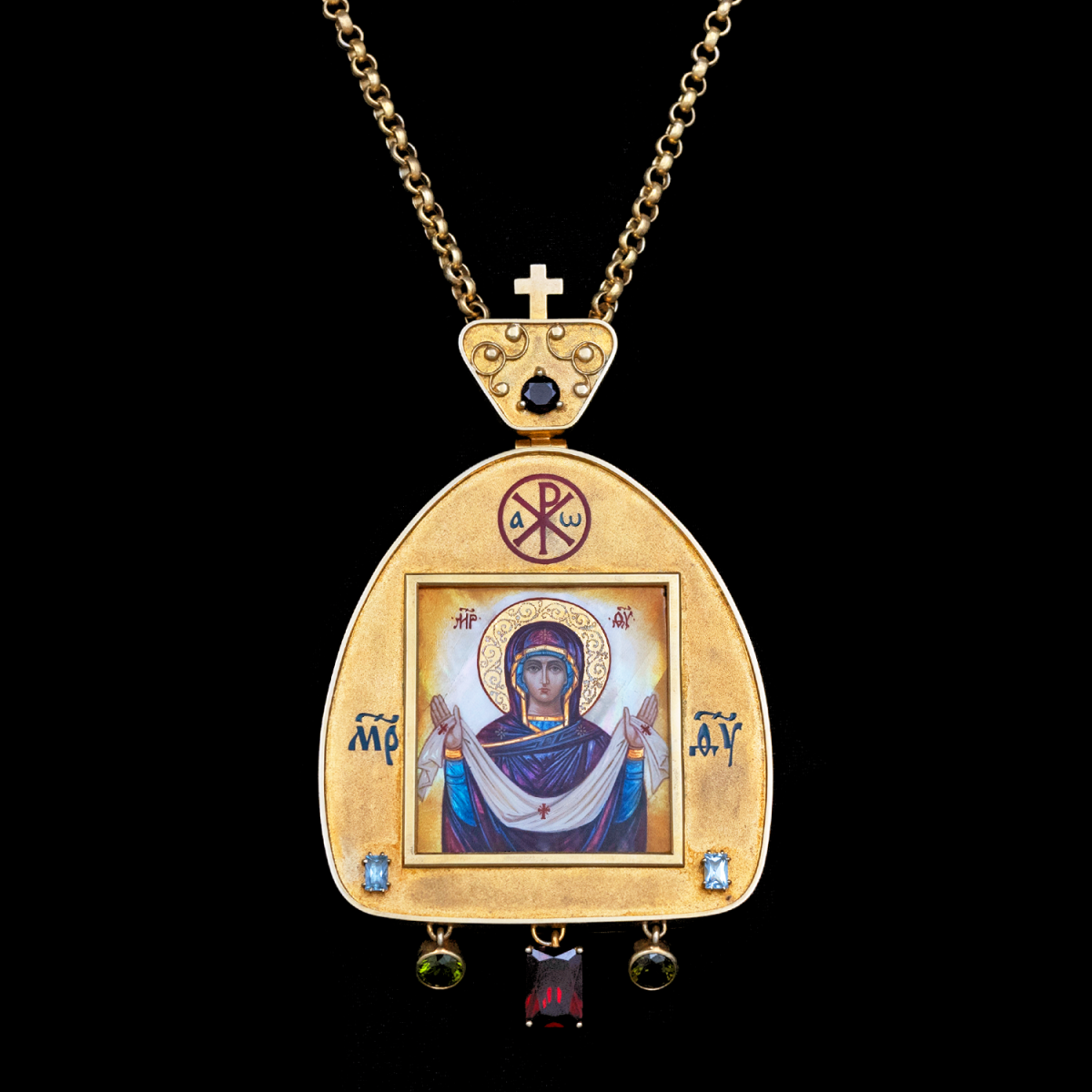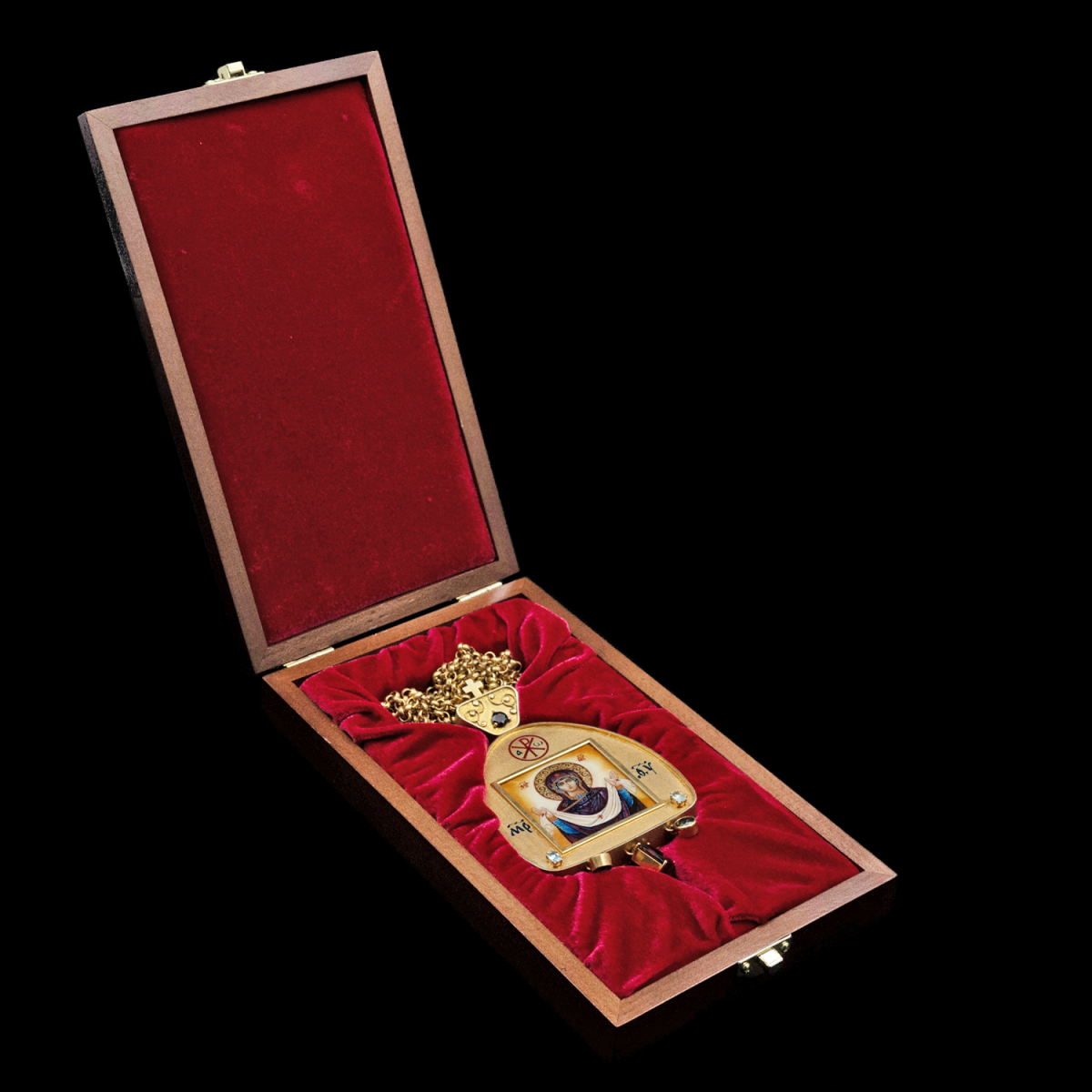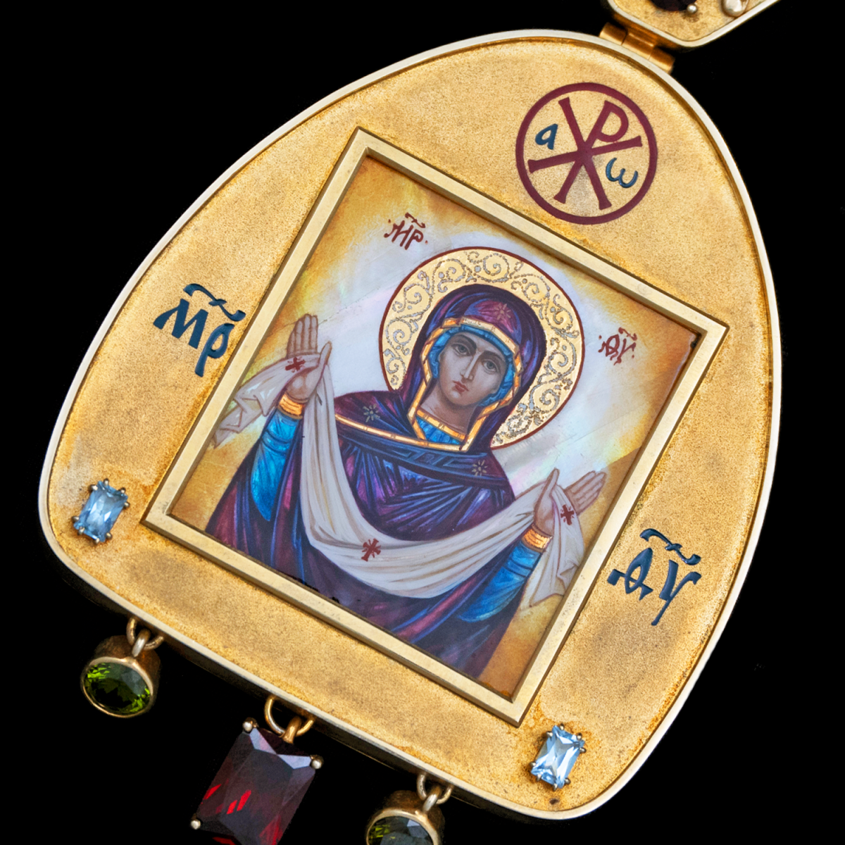 Архиерейская панагия изготовлена из серебра 925 пробы с покрытием позолоты. Центральным элементом является образ Покрова Пресвятой Богородицы, выполненная в технике иконописи на перламутре.