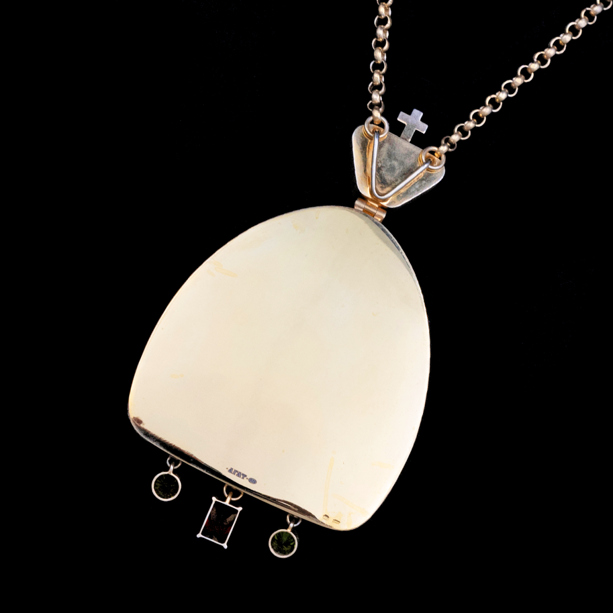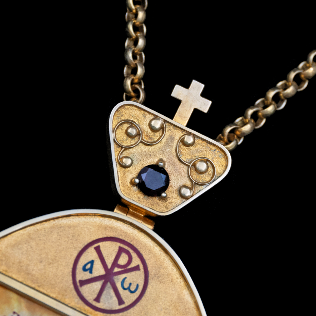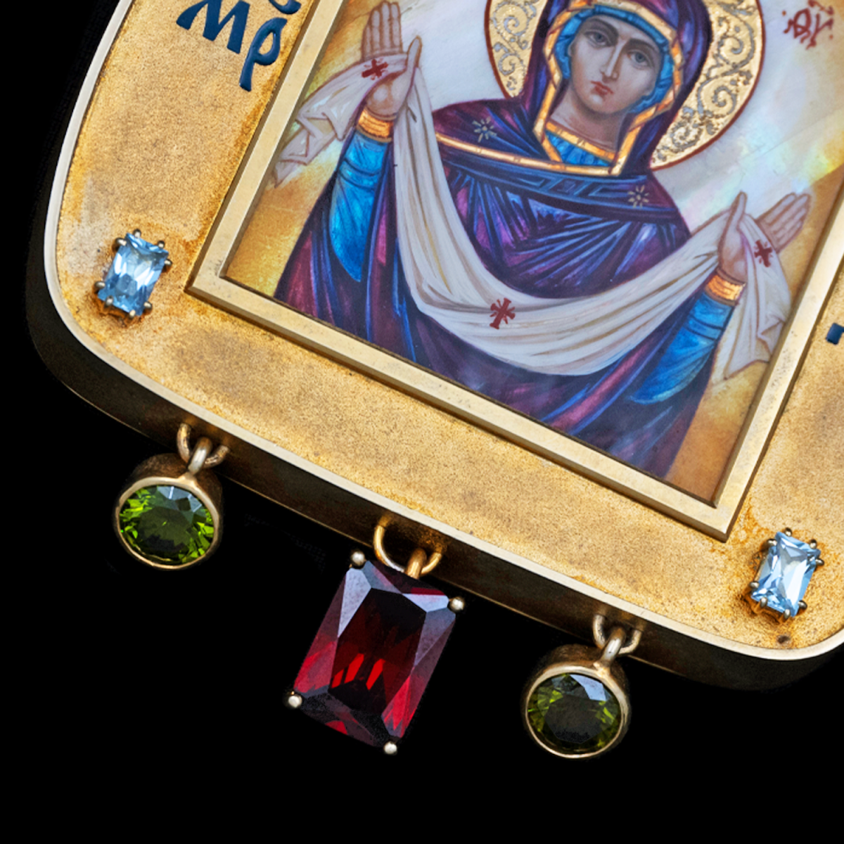 Панагия украшена вставками из природных камней — гранат, и топаз, гармонично дополняющими общий дизайн. Украшение выполнено с тонкими узорами эмали, что добавляет изделию уникальности.