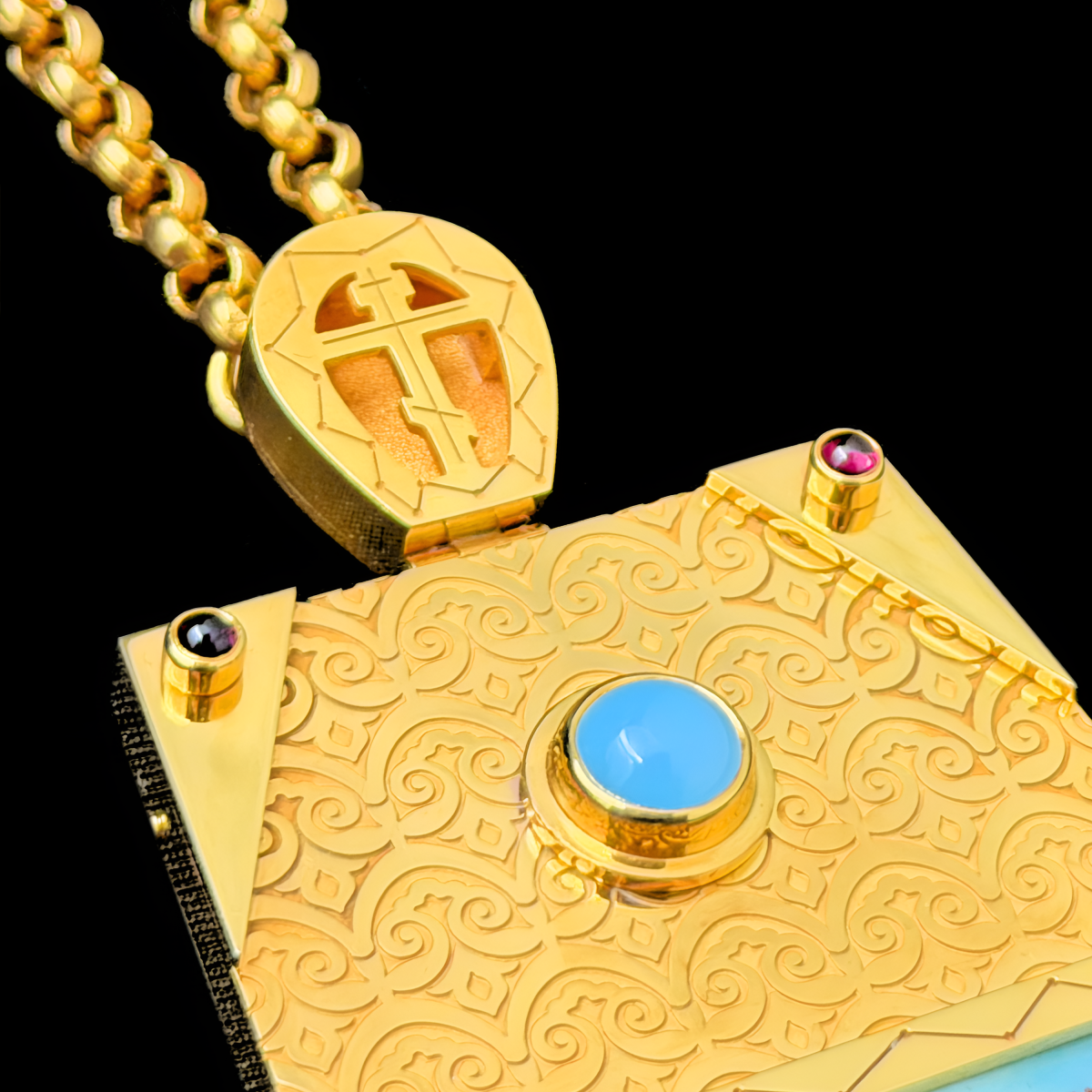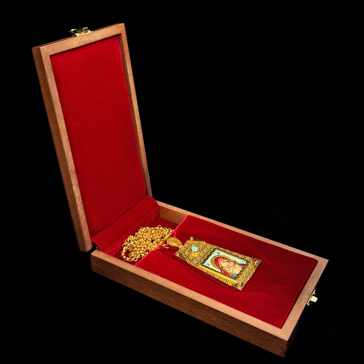 | Вставки | Иконопись на перламутре, гранат родолит, халцедон голубой | |