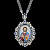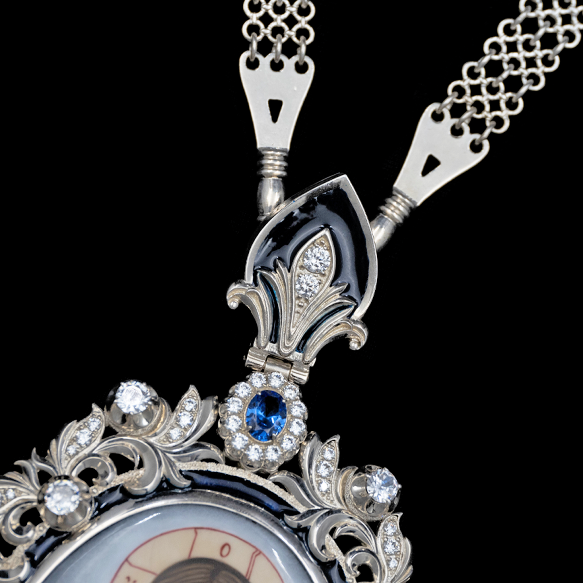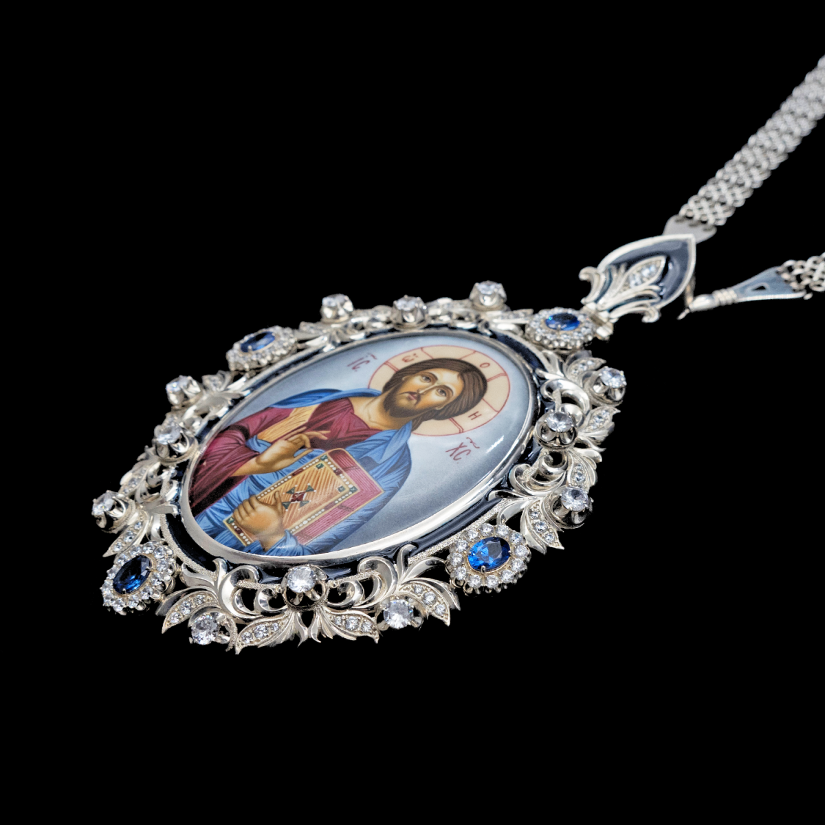 Панагия изготовлена из серебра 925 пробы, украшена вставками финифти, фианитов и эмали. Центральный образ на панагии — это икона Иисуса Христа с книгой в руке и благословляющим жестом.