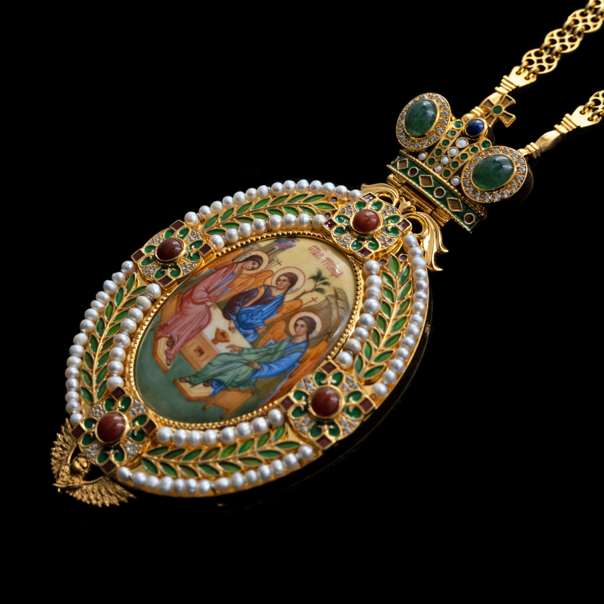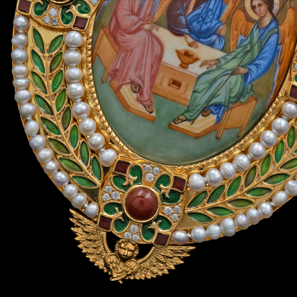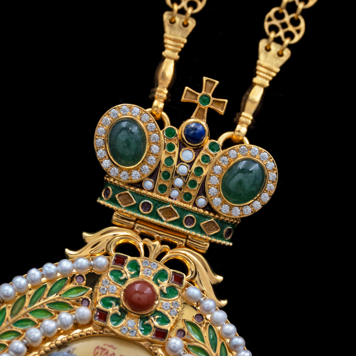| Вставки | Финифть, жемчуг культивированный, корнеол, лазурит, нефрит зеленый, горячая эмаль | |
