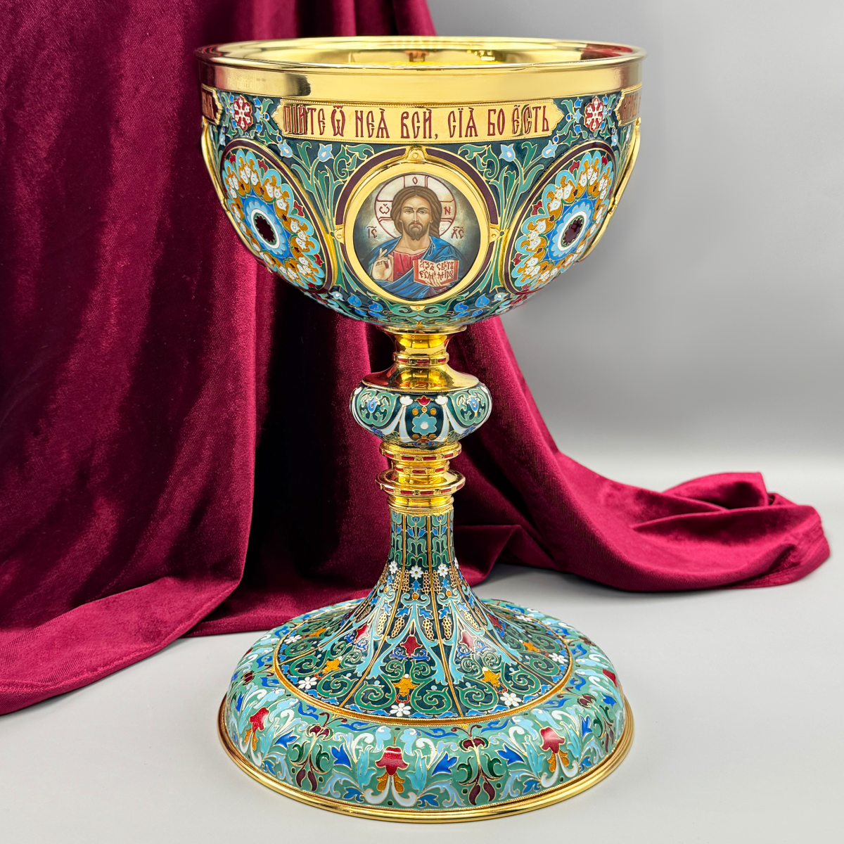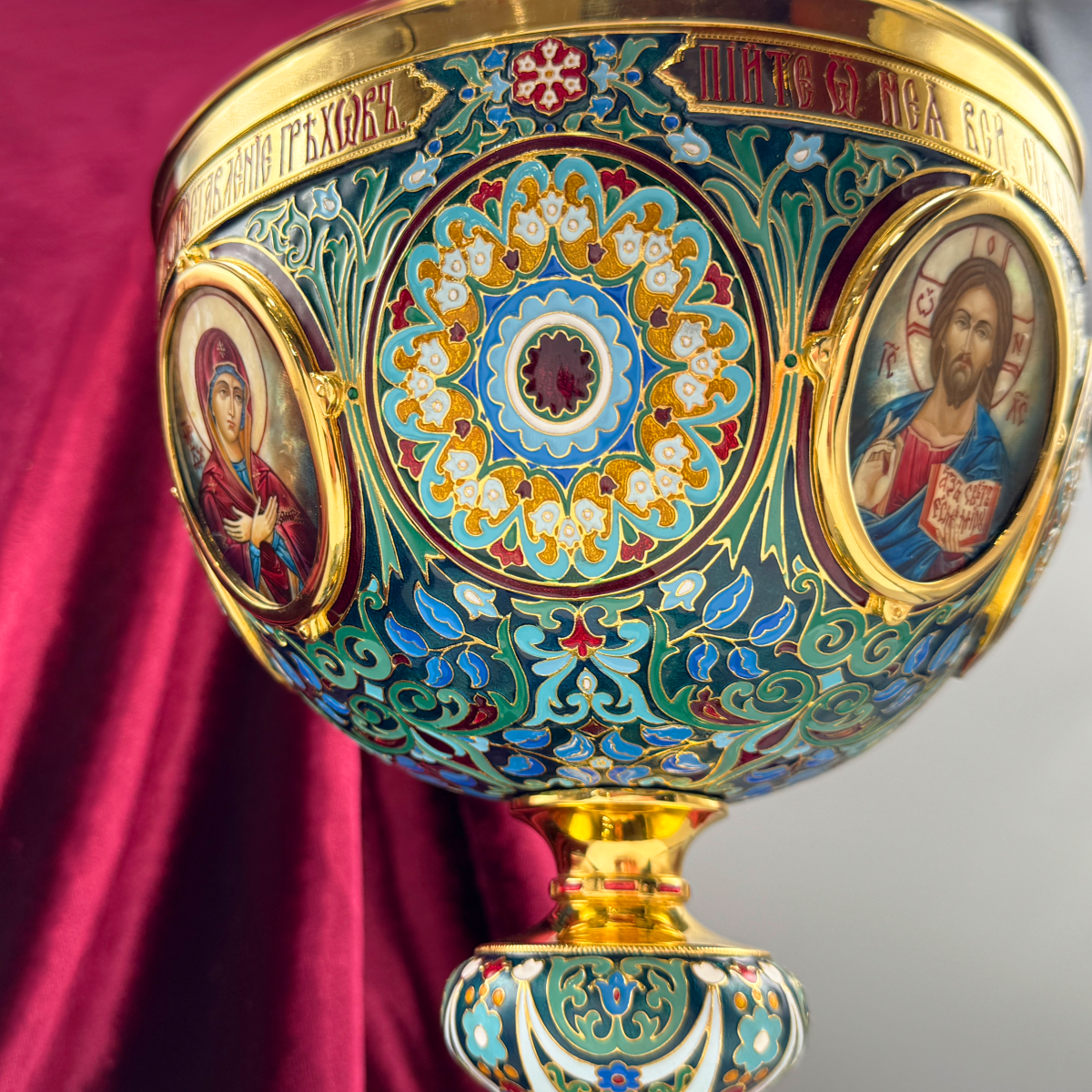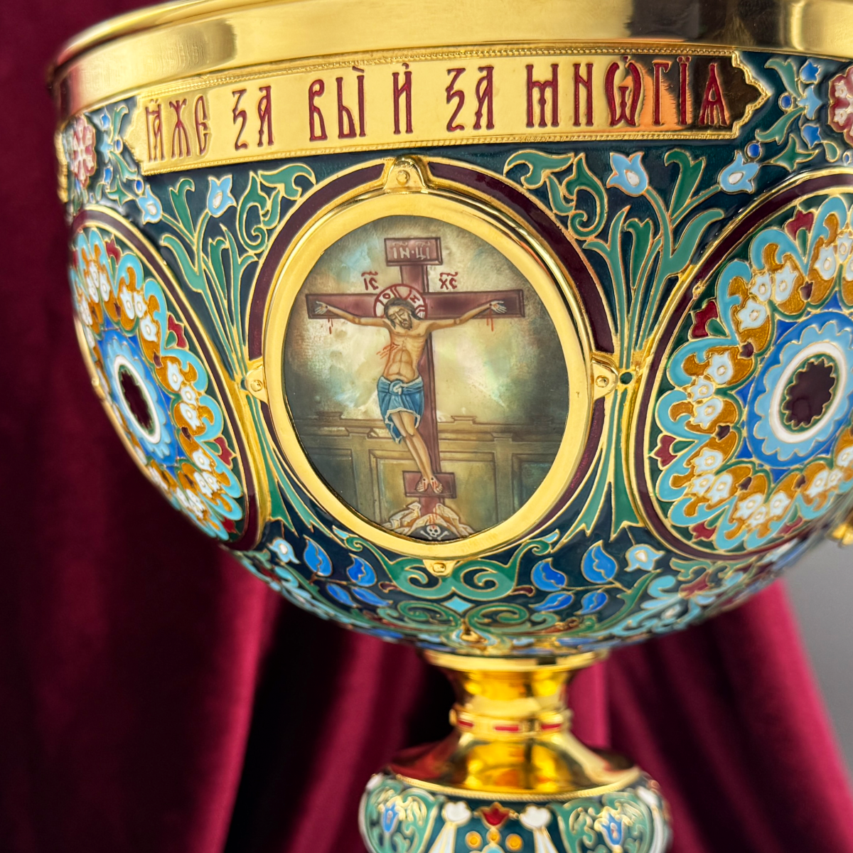 Представляем вашему вниманию изысканный потир, выполненный в сочетании с великолепной серебряной чашей и ножкой из ювелирного сплава - этот уникальный предмет, изготовленный из высококачественных материалов, с любовью и благоговением создан для святого таинства Причастия. Данный потир является истинным произведением искусства, где каждый элемент пропитан глубоким символизмом и духовной значимостью. Серебряная чаша, покрытая позолотой нежно блестит, отражая свет. Изделие декорировано эмалью и образами написанными на перламутре.