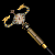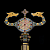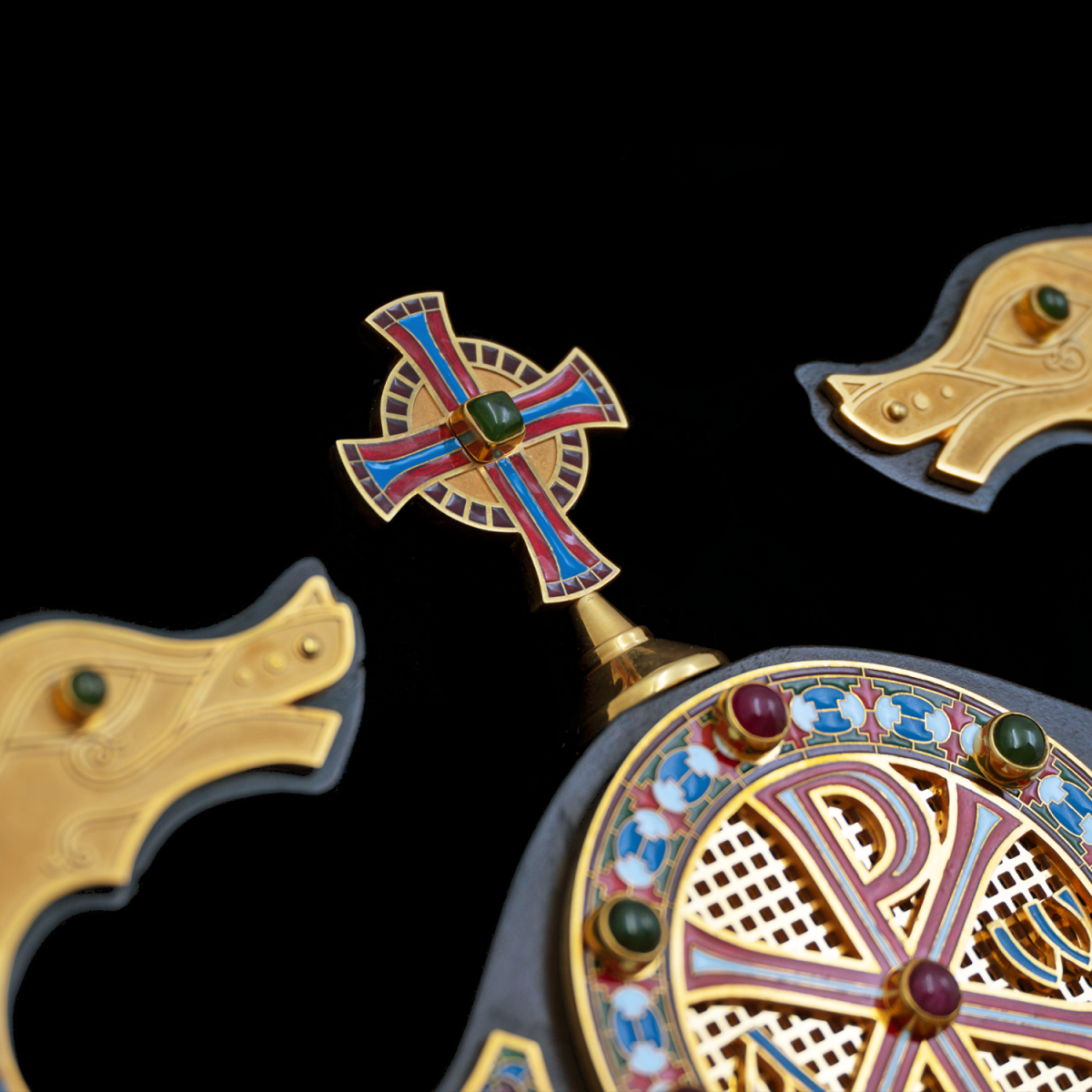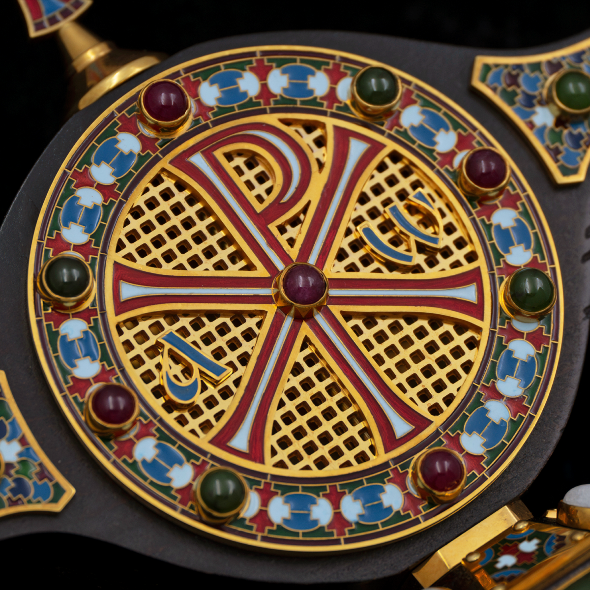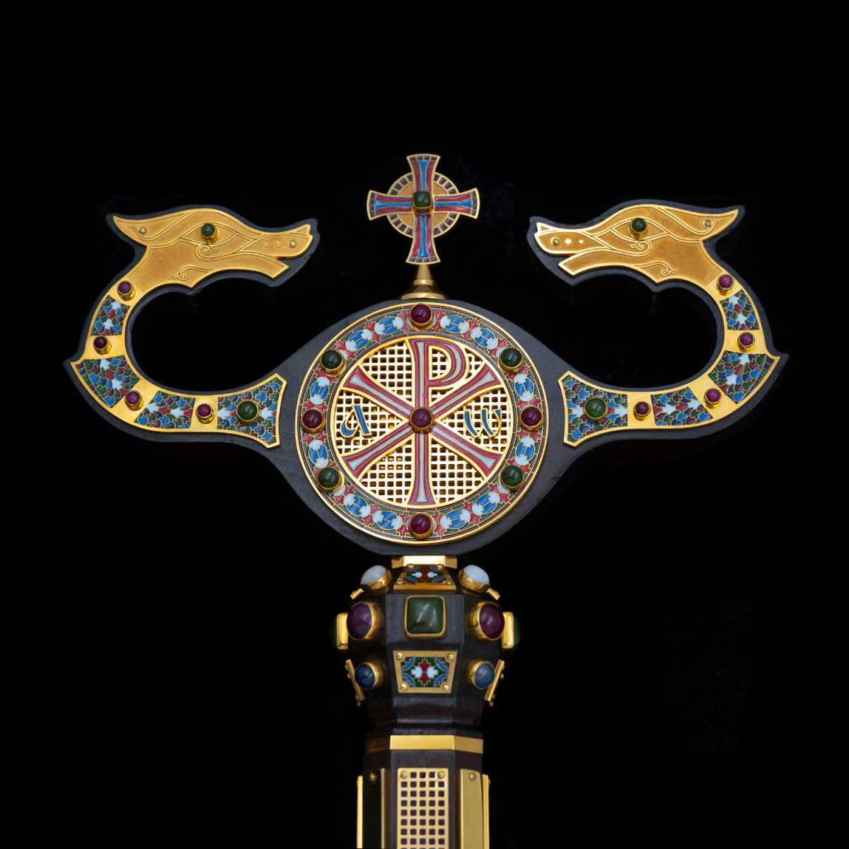 Архиерейский жезл, который является символом пастырской власти и духовного руководства. В центре жезла монограмма Христа послеконстантиновская хризма. Этот посох украшен изысканными элементами, такими как драгоценные камни, эмаль и позолота, что подчеркивает его высокий статус и значимость.