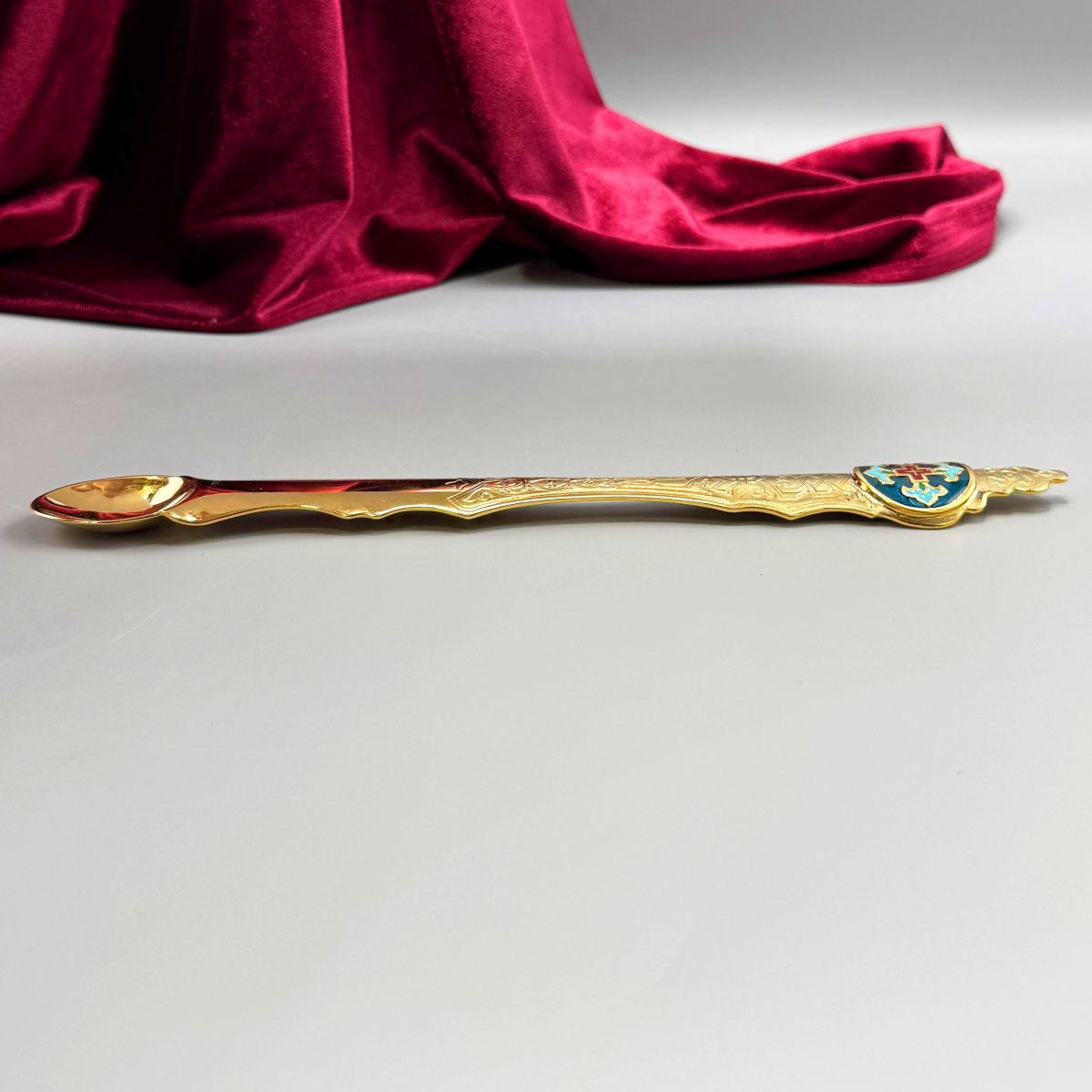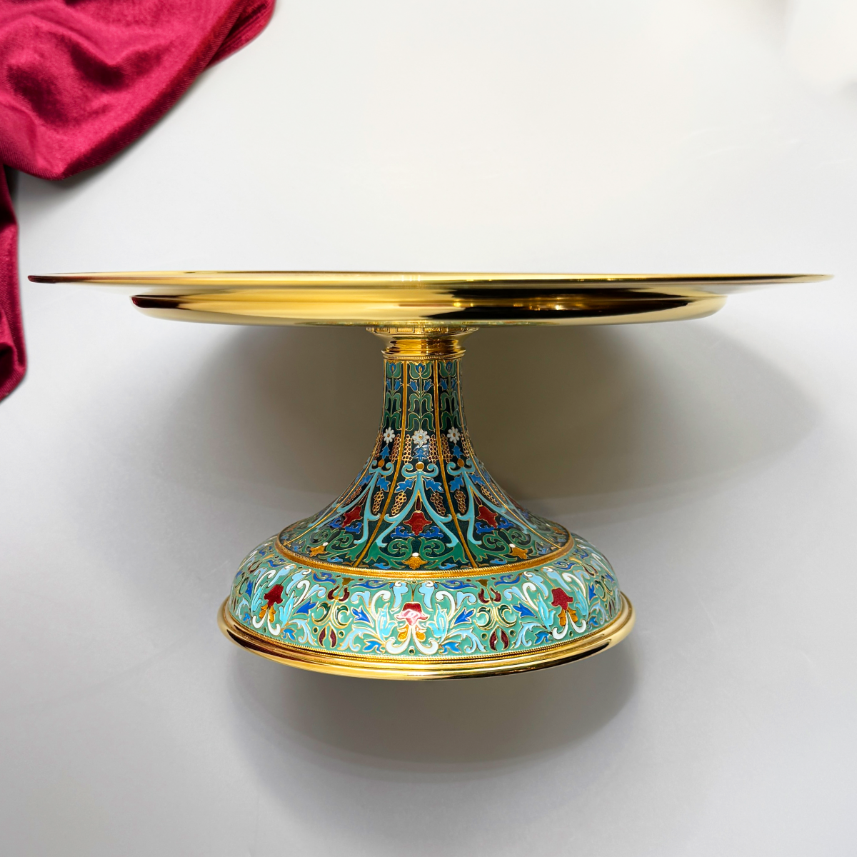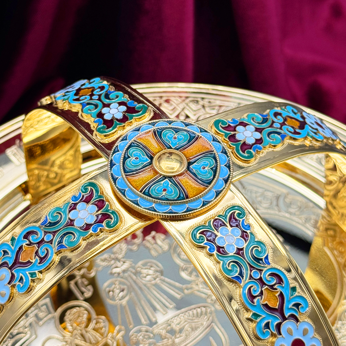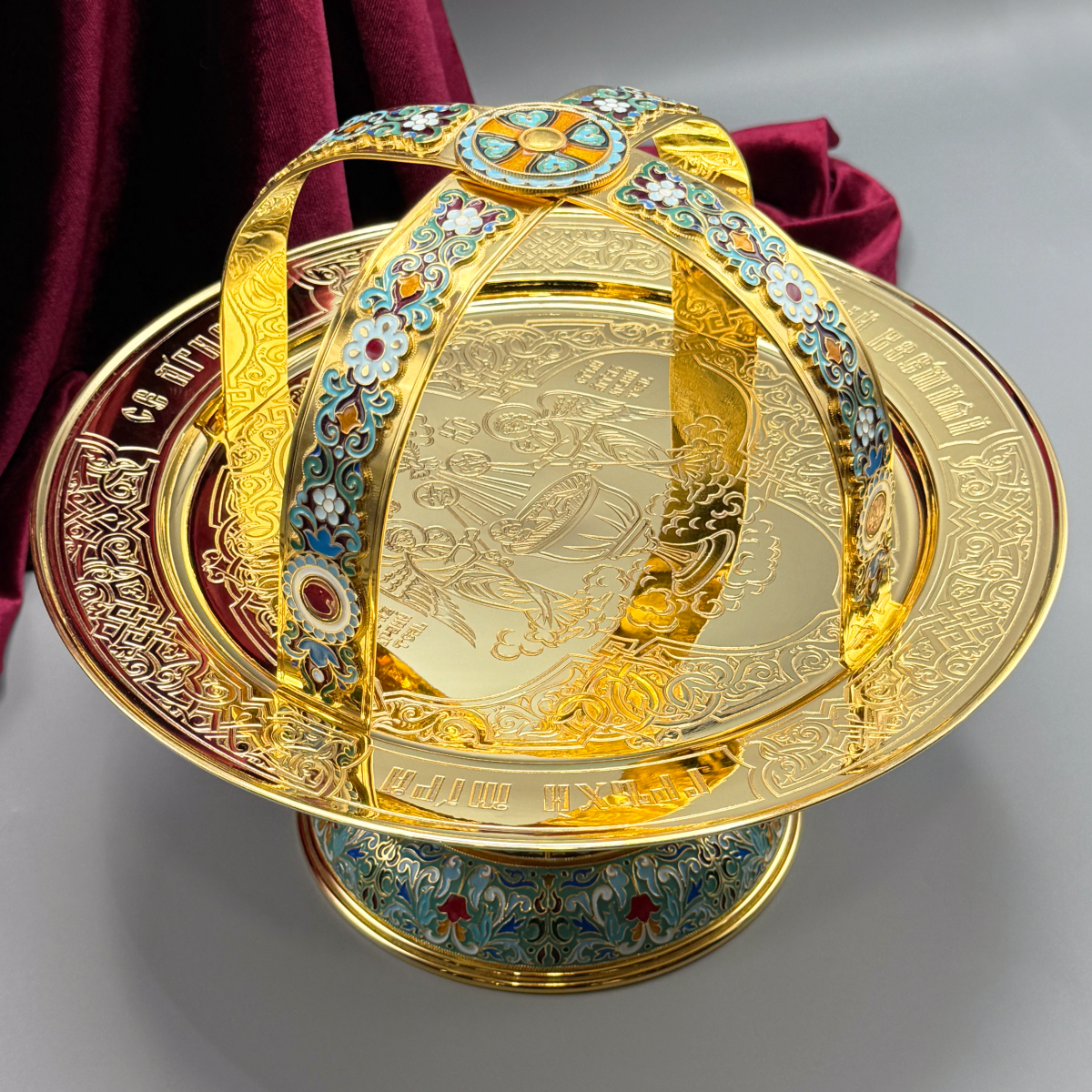 Представляем вашему вниманию евхаристический набор, выполненный в сочетании серебра, позолоты и высококачественного ювелирного сплава. Изделия изготовлены с любовью и благоговением для святого таинства Причастия. Данный набор является истинным произведением искусства, где каждый элемент пропитан глубоким символизмом и духовной значимостью. Все элементы покрыты позолотой, которая нежно блестит, отражая свет. Изделия декорированы эмалью и образами написанными на перламутре.
