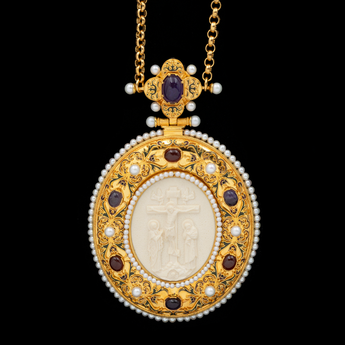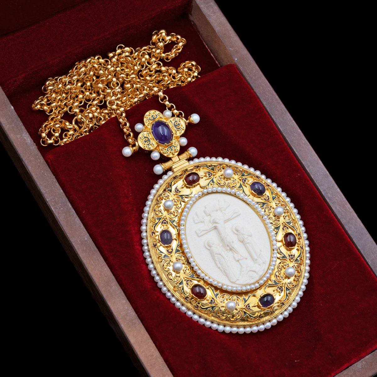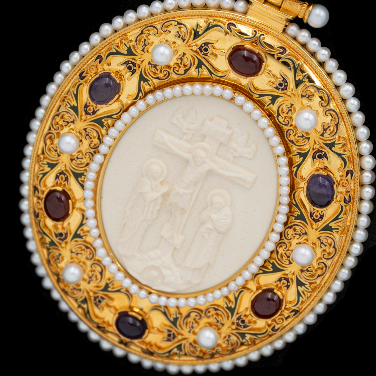 Вставки | Бивень мамонта, гранат гессонит, аметист, жемчуг культивированный | |
